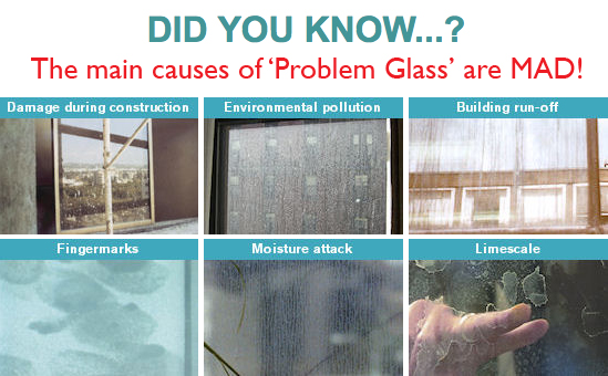 Moisture, Alkalinity and Dirt (MAD) can easily cause glass, exterior or interior, to become ‘Problem Glass’. Glass is all around us and, when new, it promises visibility, clarity and cleanliness. Unless glass is protected against MAD, it can easily break these promises before, during or after installation – with serious consequences for specifiers, fabricators, contractors, installers, building owners and occupants.
